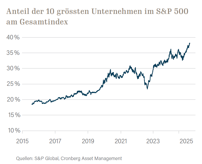Das gesamtwirtschaftliche Potenzial schlägt sich auch an den Finanzmärkten nieder. Der breite amerikanische Aktienindex S&P 500 markierte in den letzten Jahren regelmässig Höchststände. Allerdings konzentriert sich der Marktwert zunehmend: Fast 40% der gesamten Marktkapitalisierung entfallen inzwischen auf die zehn grössten Unternehmen – vor allem auf Technologiegiganten wie Apple, Microsoft oder Alphabet. Vor zehn Jahren waren es noch 20%. Dieser Trend hält an.