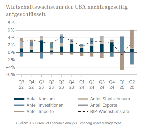 Auch die Binnenwirtschaft der USA trägt zur wirtschaftlichen Stärke und gleichermassen zur Stabilität bei: Rund 70% des Bruttoinlandsprodukts stammen aus dem privaten Konsum, der dank starkem Arbeitsmarkt und steigenden Reallöhnen robust bleibt. Die Arbeitslosenquote liegt seit Jahren nahe historischer Tiefstände. Hinzu kommt die weitgehende Energieautarkie der USA – ein Vorteil, der geopolitische Risiken abfedert. Die Vereinigten Staaten von Amerika verfügen insgesamt über eine beeindruckende Stärke von innen heraus. Dennoch bewegen sich die USA nicht im luftleeren Raum, sondern sind global in einem engen Handelskorsett eingebunden und auch auf Kapitalflüsse vom Ausland angewiesen. Diese gingen jüngst aufgrund der hohen Unsicherheiten im Handels-konflikt zurück. Zuletzt wurde das BIP-Wachstum der USA hauptsächlich von sinkenden Importen, welche negativ in die BIP-Berechnung einfliessen, getragen.