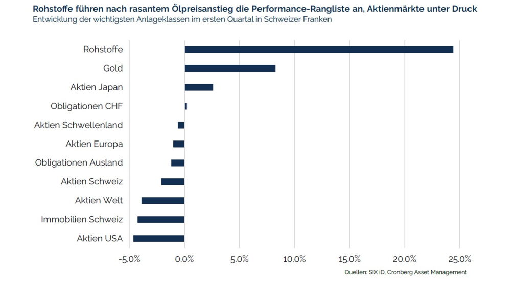 Der geopolitische Schock im Nahen Osten liess die Energiepreise in einer Geschwindigkeit und Dimension steigen, die ihresgleichen sucht. So legte der Rohölpreis der Sorte Brent im März um rund 55 Prozent zu – der zweithöchste monatliche Anstieg seit vier Jahrzehnten. Die Einschränkungen des Schiffsverkehrs durch die Strasse von Hormus, über die rund ein Fünftel des globalen Seehandels mit Öl und Gas abgewickelt wird, haben die Risikoprämien weltweit neu kalibriert. Auch die Aktienmärkte reagierten – wenn auch mit etwas zeitlichem Abstand, da zunächst von einem raschen Ende ausgegangen wurde – zum Quartalsende deutlich. Mit einem Minus von -4.6% in CHF schloss der US-Leitindex S&P 500 das erste Quartal am schwächsten aller wichtigen Aktienregionen ab. Doch europäische und mintunter die Schweizer Aktien korrigierten im März weit stärker als ihre amerikanischen Pendants. Sie profitierten allerdings von einem zu Jahresbeginn aufgebauten grösseren Polster. Der Grund der stärkeren Korrektur europäischer Aktien liegt in deren grösseren Abhängigkeit von Energie aus dem Nahen Osten. Auffällig war in den ersten drei Börsenmonaten zudem, dass sich gerade im aktuellen Stressumfeld einzelne Anlageklassen wie die Preisentwicklung von Gold nicht wie erwartet verhalten haben.