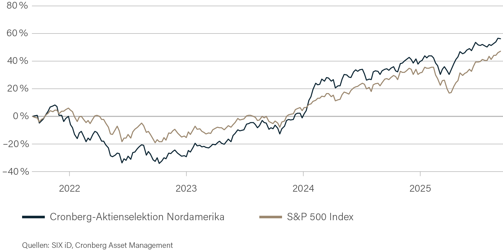 Unsere konsequente Selektionsmethodik hat sich in den vergangenen Monaten erneut bewährt. Unternehmen mit stabilen Cashflows, klarer Zukunftsausrichtung und Innovationsstärke haben sich als wertvolle Bausteine im Portfolio erwiesen. Dies spiegelt sich auch in der Performance wider: Seit Lancierung unserer Nordamerika-Selektion haben wir eine Überschussrendite von 9,25% gegenüber dem S&P 500 erzielt.
