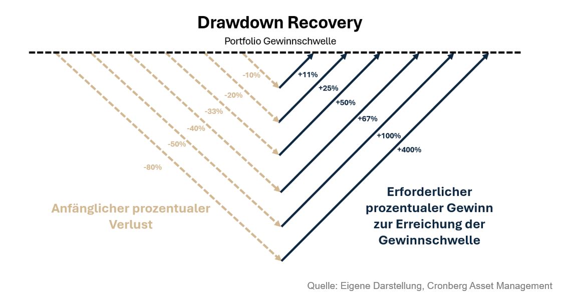 Verluste an den Finanzmärkten gehören zum Investieren wie Ebbe und Flut zum Ozean. Doch in stürmischen Phasen, wenn Kurse abrupt und rasant fallen, Schlagzeilen von Rezession und Krisen dominieren, stellen sich einige nicht nur die Frage, ob man investiert bleiben soll, sondern wie viel Performance nötig ist, um die Buchverluste wieder auszugleichen (Drawdown recovery). Die erste Frage ist bei einer optimal auf die persönliche Situation abgestimmte Anlagestrategie meist irrelevant. Was für die Beantwortung der zweiten Frage viele nicht wissen: Verluste wirken nicht linear. Ein Minus von zehn Prozent lässt sich mit einem Plus von elf Prozent ausgleichen, was noch überschaubar ist. Doch bei fünfzig Prozent braucht es bereits eine Verdopplung, also einhundert Prozent, um wieder auf den Ausgangspunkt zurückzukehren. Und ein Rückgang um achtzig Prozent erfordert gar eine Vervierfachung, ein Szenario, das für viele Portfolios kurz bis mittelfristig kaum mehr realistisch ist. Diese Mathematik ist gnadenlos, und gerade deshalb ist sie so relevant. Wer in einer Marktkorrektur panisch reagiert und seine Positionen verkauft, realisiert Verluste, die sich nur mit aussergewöhnlicher Performance wieder aufholen lassen, sofern man überhaupt den Wiedereinstieg wagt. Doch genau dieser Moment wird oft verpasst, denn die Psychologie spielt Anlegern immer wieder denselben Streich.