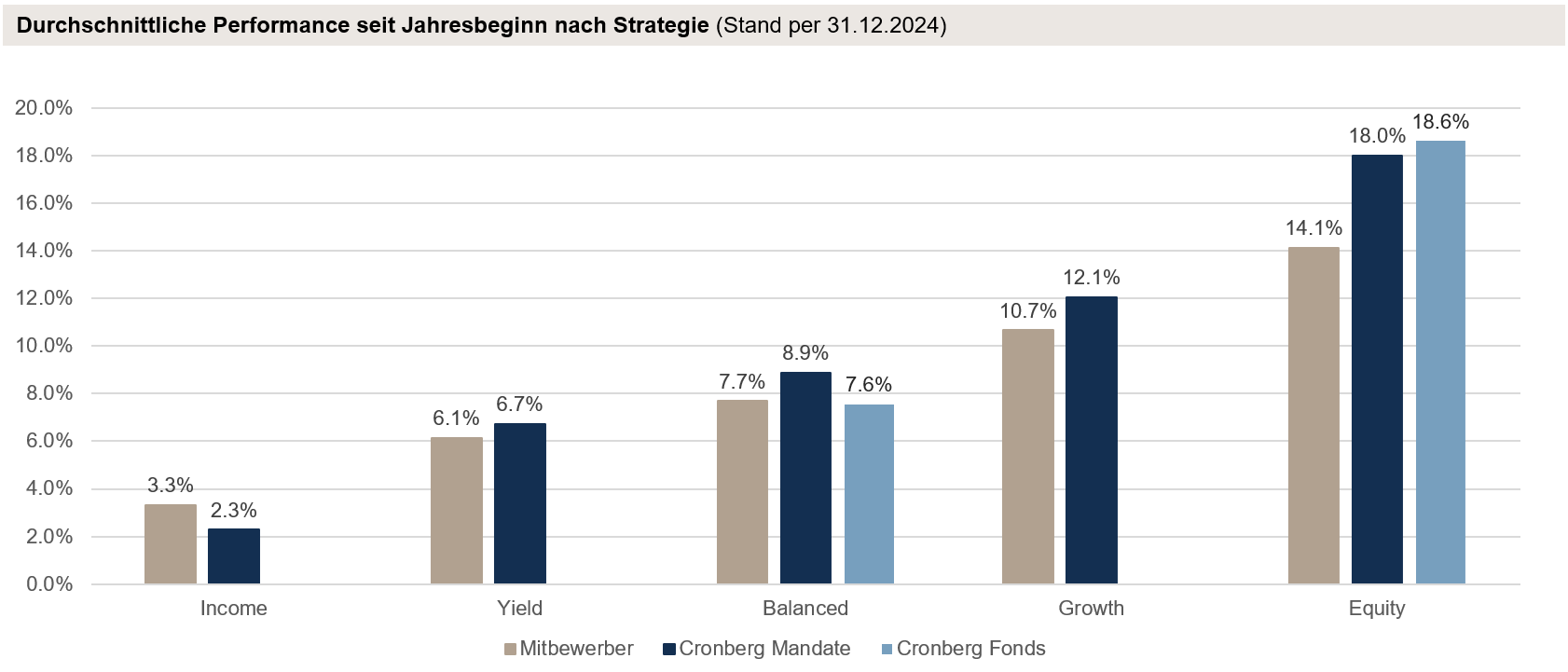 Durchschnittliche Performance der Mitbewerber und Cronberg-Mandat nach Anlagestrategien