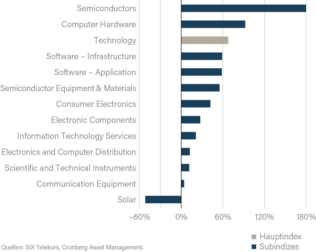 Zuletzt ist der Aufwärtstrend etwas ins Stocken geraten. Die Kurse der Technologieunternehmen wurden volatiler. Grössere Kurseinbrüche von 10 bis 20 % bei Technologiewerten sind keine Seltenheit. Das wirft Fragen auf: Droht eine Blase zu platzen oder schaffen es die Unternehmen tatsächlich, den erhofften Produktionsschub zu realisieren?