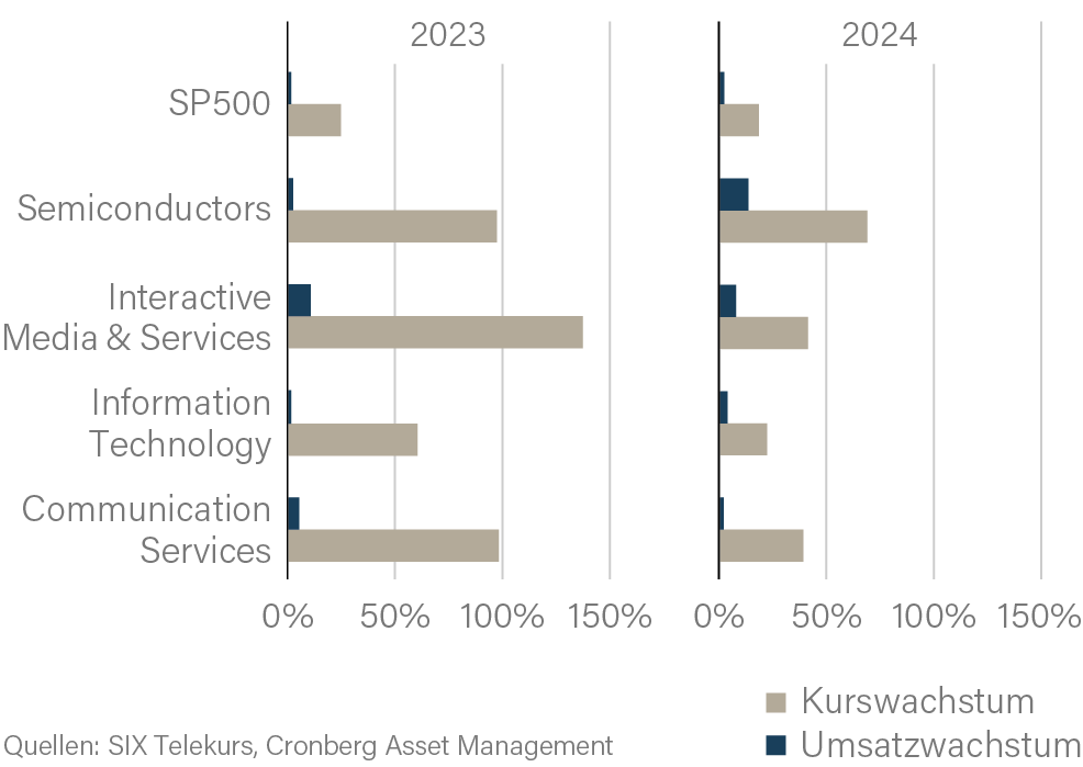 Eine Spekulationsblase entsteht dann, wenn Investoren aufgrund hoher Erwartungen an zukünftige Unternehmensgewinne bereit sind, mehr für einen Vermögenswert zu bezahlen, als es dessen fundamentaler Wert nahelegen würde. Anzeichen dafür sind beispielsweise stark steigende Kurse, während Gewinne stagnieren oder deutlich hinterherhinken. Tatsächlich trifft dies zumindest teilweise auf die aktuelle Situation zu. Die Vorreiteraktie der KI-Unternehmen, Nvidia, löste erst dieses Jahr Tesla als die am meisten gehandelte Aktie auf dem Markt ab. Die Fundamentaldaten lassen allerdings noch nicht den Schluss zu, dass die aktuelle Kursentwicklung auf mehr zurückzuführen ist als eben nur die hohen Erwartungen der Anleger. Dass der Aktienmarkt als Summe der Marktkapitalisierungen sämtlicher börsenkotierter Unternehmen in den USA schneller wächst als die reale Wertschöpfung, ist weder neu noch selten. Im Zeitraum von 1952 bis heute ist der US-Aktienmarkt im Durchschnitt um rund 3.5 Prozentpunkte schneller gewachsen als deren Wertschöpfung. Auf den S&P 500 heruntergebrochen ergab sich im vergangenen Jahr jedoch ein beeindruckendes Bild. Während die Umsätze der im Index enthaltenen Unternehmen durchschnittlich nur um 1.6 % wuchsen, verzeichnete der Index ein Kurswachstum von 22.5 %. Dieses Missverhältnis zwischen Markt- und Kurswachstum war bei den Technologieunternehmen besonders stark ausgeprägt. Auch im laufenden Börsenjahr wachsen die Kurse immer noch schneller als die Umsätze der Unternehmen. Das Missverhältnis scheint sich jedoch abzuschwächen, weil Technologieunternehmen tatsächlich allmählich höhere Umsätze ausweisen.