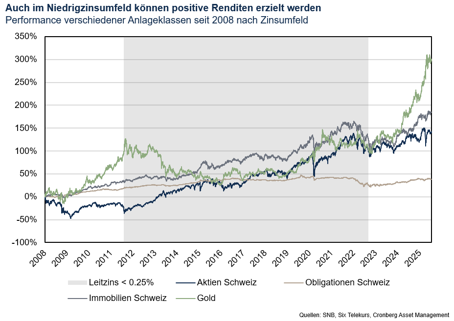 Gewiss, im aktuellen Umfeld gestaltet es sich schwierig, solide Obligationen zu finden, die dennoch einen Mehrwert bieten. Dennoch gibt es sie. Die Auswahl benötigt mehr Geduld und Zeit. Entscheidend ist jedoch die grundsätzliche Frage: Welches Ziel soll mit dem Vermögen erreicht werden? Aus dem konkreten persönlichen Anlageziel ergibt sich die passende Allokation und Auswahl der Anlageklassen – jede mit ihrer spezifischen Funktion.