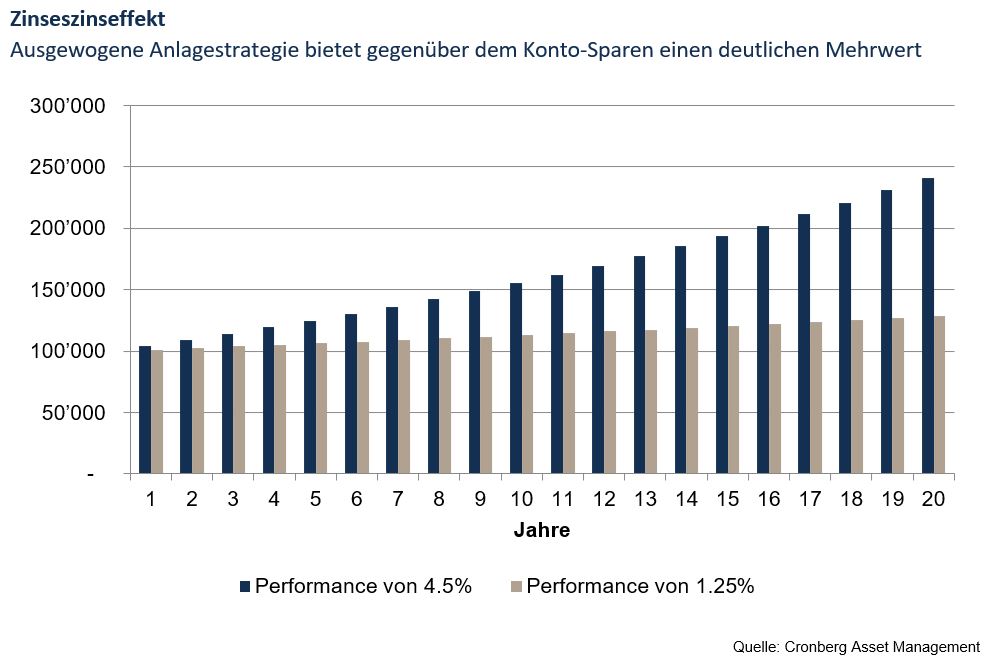 Mit einer ausgewogenen Anlagestrategie (vereinfacht ausgedrückt: 50% Aktien und 50% Obligationen) konnte im langfristigen Durchschnitt eine Performance von 4.5% pro Jahr erreicht werden. Gegenüber dem reinen Kontosparen lässt sich damit langfristig einen deutlichen Mehrwert erzielen. Der Zinseszins verstärkt diesen Effekt. Bei einem Anlagehorizont von 20 Jahren beträgt die Differenz zwischen reinem Konto-Sparen mit einer Verzinsung von 1.25% gegenüber einer ausgewogenen Anlagestrategie und einer Performance von 4.5% rund 112'968 Franken.